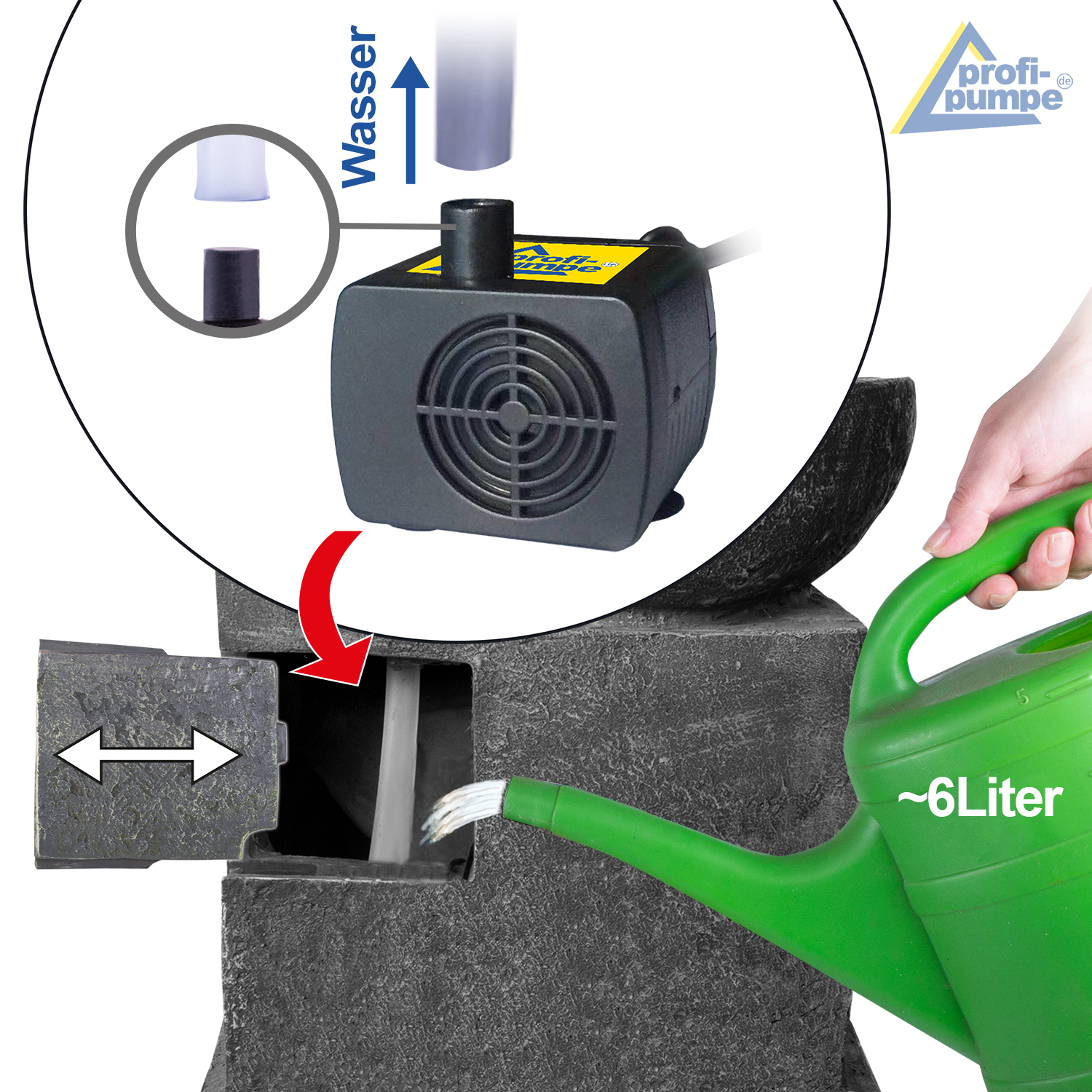 Примечание: Frost kann zu Schäden am Gartenbrunnen und der Pumpe führen. Bei Frostgefahr muss der Gartenbrunnen und die Pumpe entleert werden, mit klarem Wasser gespült und trocken eingelagert werden. Dann haben Sie sehr lange Freude daran!