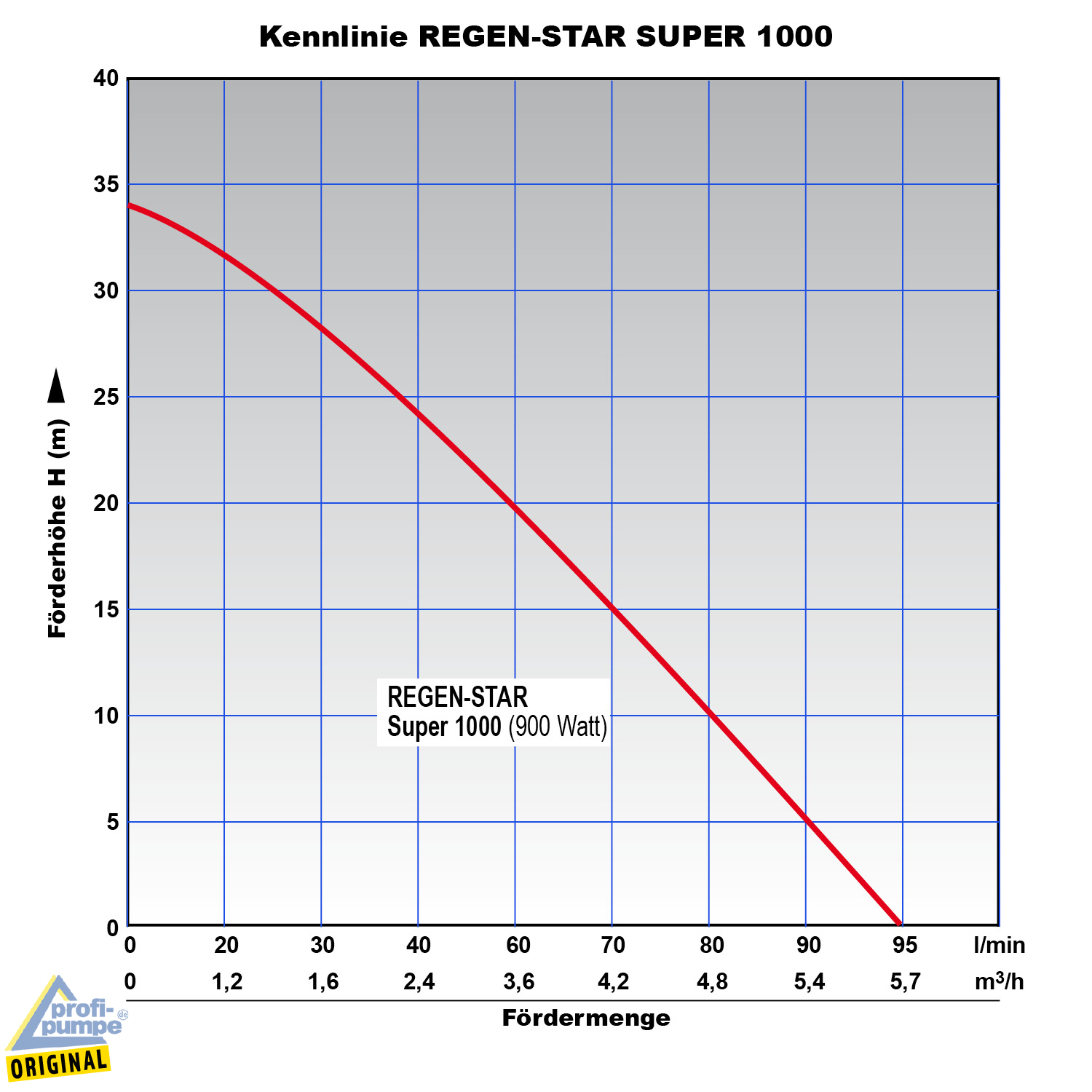 Die hochwertige mehrstufige Tauchdruckpumpe REGEN-STAR-SUPER 1000 mit geschlossenen Radiallaufrädern ist für die Förderung von sauberem Wasser mit einer max. Temperatur von 35°C bestimmt. Die Tauchpumpe AQUA SUPER 1000 fördert das Wasser mit einem Druck von 3,3 bar (üblicher Leitungsdruck) an die Abnahmestellen im Haus oder Garten. Sie kann sowohl waagrecht als auch senkrecht betrieben werden. Sie zeichnet sich durch ausgesprochene Laufruhe und geräuscharmen Betrieb aus. Grundsätzlich ist diese Pumpe ausschließlich für Klarwasser mit einem Sandgehalt von max. 60 gr/cbm einzusetzen. Zu beachten ist jedoch: Je höher der Sandanteil, umso größer ist die Pumpenabnutzung und umso mehr Betriebsstörungen jeglicher Art können auftreten.